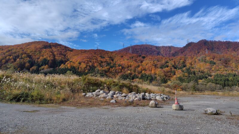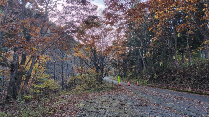 道中、紅葉も盛りでいい感じだなぁと、朝の気怠さを纏いながら車を走らせていたところ、あと5分くらいで稲包山の駐車スペースに到着という所で、道が通行止め・・・。
