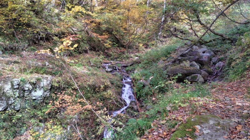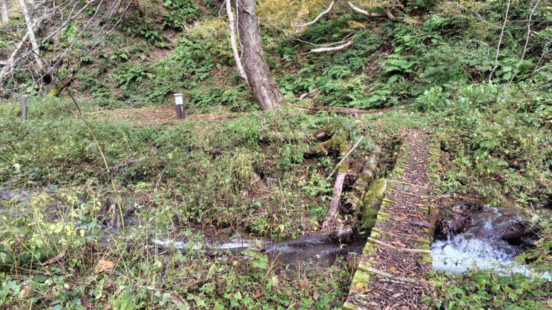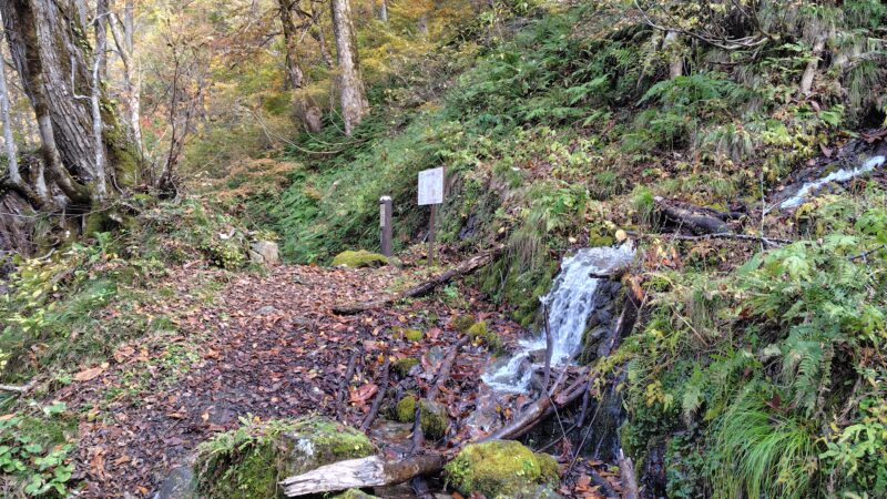 中間辺りで、遊歩道上に沢が流れ込んでいます。