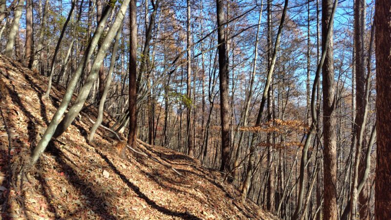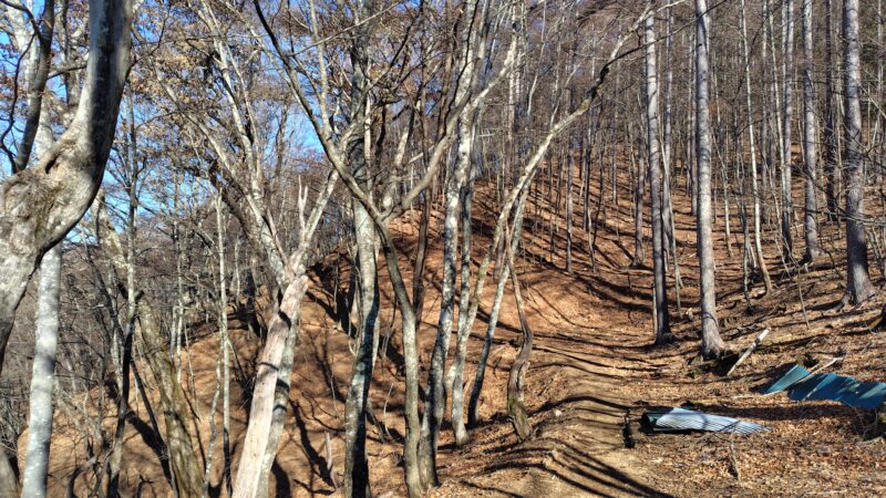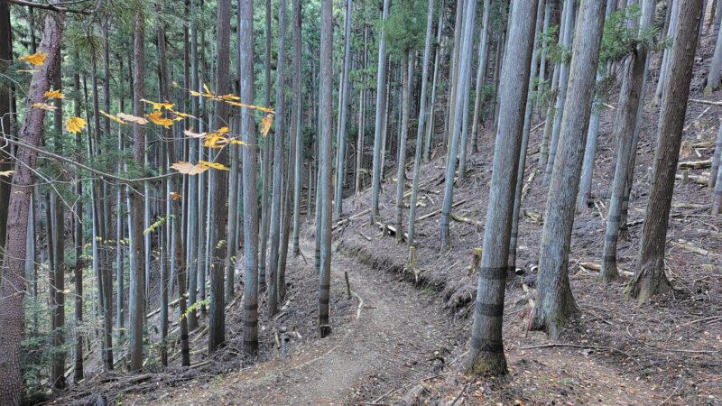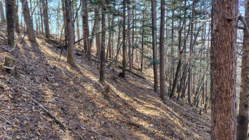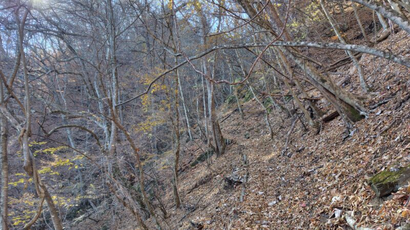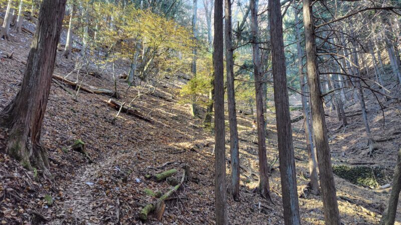 ここの区間を3分の1ほど下っていくと、斜面が少し急になり始めて、作業道が交差し出します。
