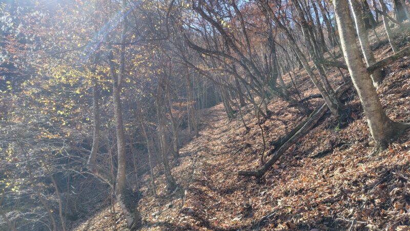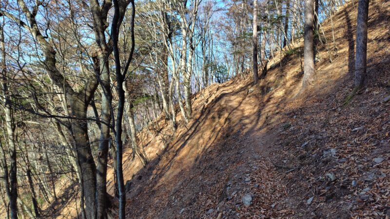 ここからは、斜面を巻いていく道で、尾根筋まで上がります。